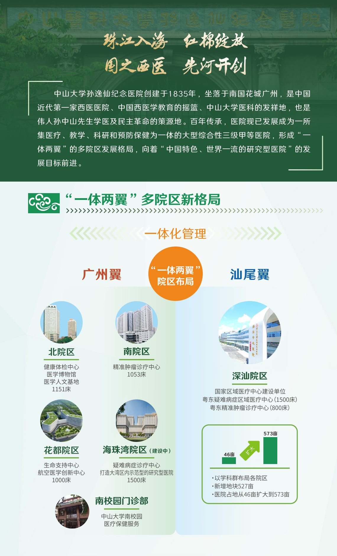 中山大学孙逸仙纪念医院创建于1835年,是我国历史最为悠久的西医医院,是中山大学医科的发源地。百年传承,医院现已发展成为一所集医疗、教学、科研和预防保健为一体的大型综合性三级甲等医院。目前,医院共有五个院区,包括位于广州市内的北院区、南院区、花都院区、海珠湾院区(建设中),以及位于汕尾市的深汕院区(深汕中心医院,托管)。另设有中山大学南校园门诊部。