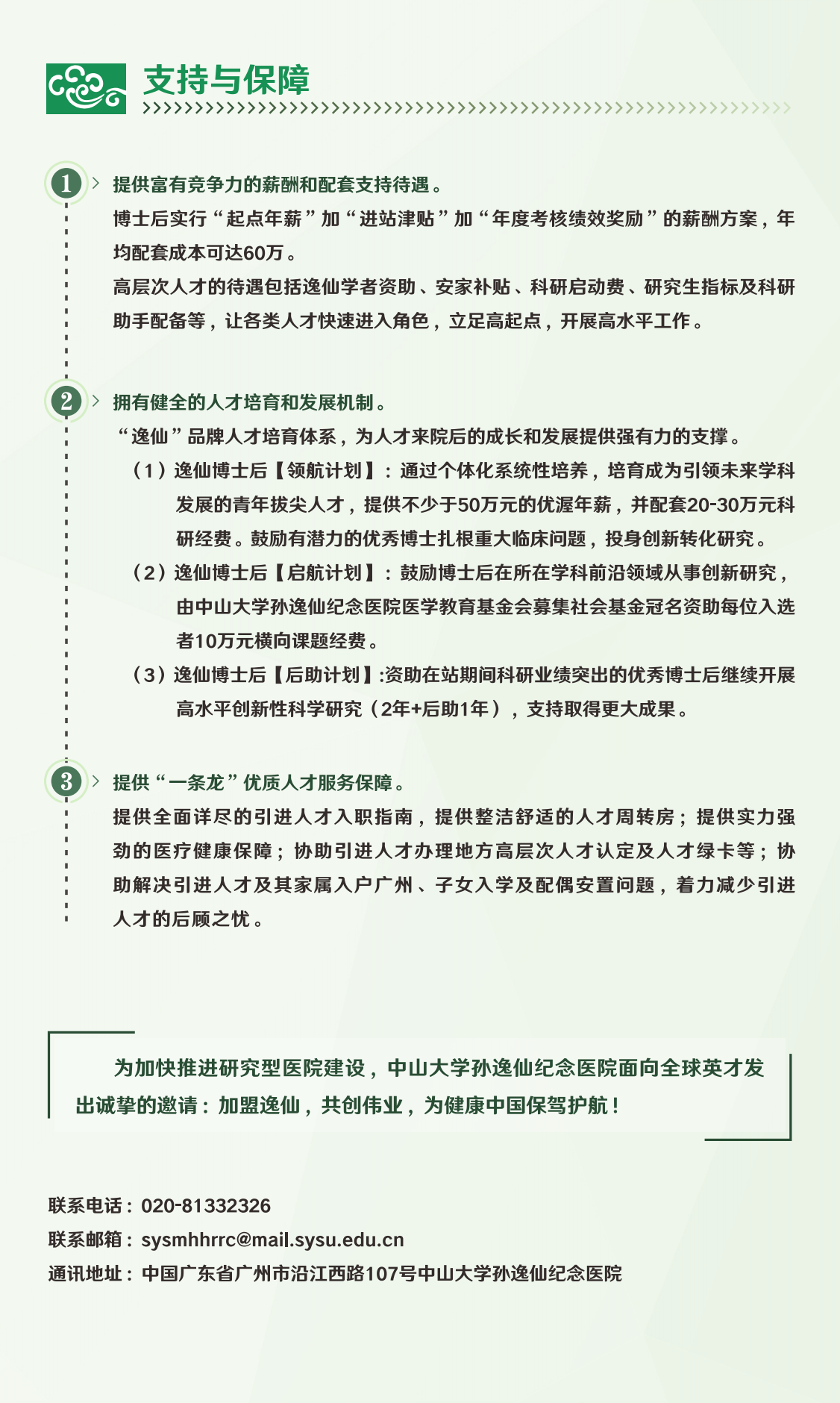 岗位招聘均为“定岗招聘”。博士毕业生来院后,可选择进入博士后人才支持培养。博士后在站期限一般为2年,期间医院设立「领航」、「启航」、「后助」等多项培优项目支持博士后以重大临床问题为导向,开展各类创新性转化性研究。同时支持申报博士后创新人才支持计划、国家级、省部级博士后引才项目、中山大学国际联合培养项目及各类派出学习项目。