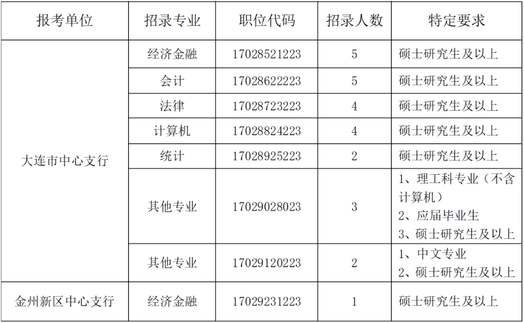 中国人民银行按照“公开、平等、竞争、择优”的原则,组织实施分支机构和部分所属单位2023年度人员录用招考(招聘)工作。按照工作统一部署,中国人民银行大连市中心支行2023年度计划招录26名员工(机关本级25人,辖属金州新区中心支行1人),招录专业及相关要求如下。