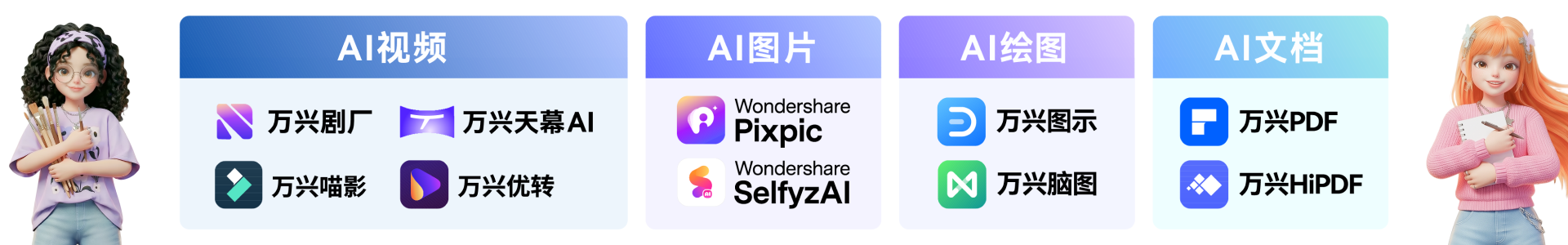 万兴科技(股票代码:300624.SZ)AIGC软件A股上市公司,全球领先的新生代数字创意赋能者。公司以“让世界更有创意”为使命,面向全球新生代用户提供简单高效的数字创意软件、潮流时尚的创意资源和丰富多元的生态化服务,赋能人们在数字时代与众不同地进行创意表达,帮助每一个新生代创作者将头脑中的灵感变为可见的现实。