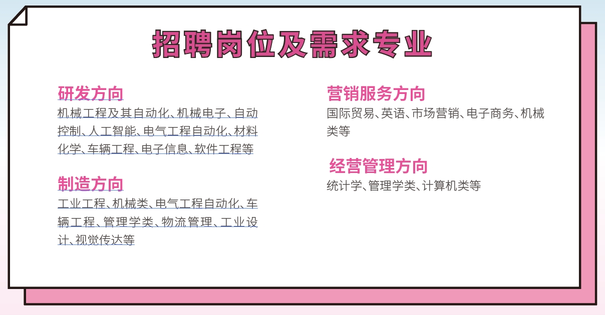 需求专业:工业工程、机械类、电气工程及其自动化、车辆工程、管理学类、物流管理、工业设计、视觉传达等